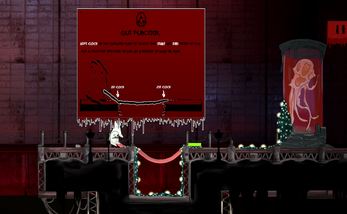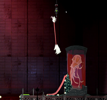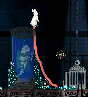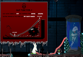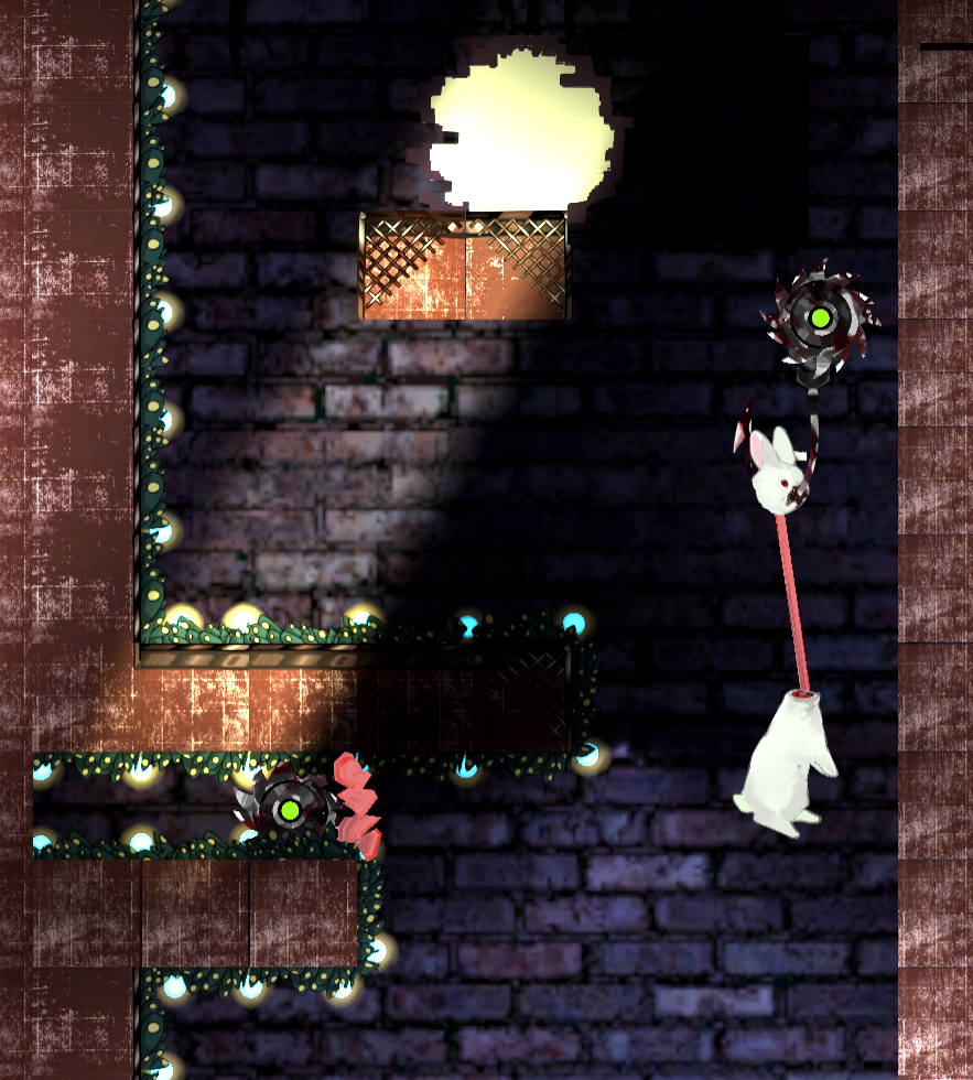 游戏共有三关,第一关是主角机制教学[架桥、抓钩],第二关是障碍教学[齿轮会造成伤害,肠子可以拦截齿轮],第三关是一个解谜+动作的完整横板闯关关卡,使用教学的机制进行设计。游戏有趣的点在于肠子和地形的交互可以架桥,肠子和齿轮的交互可以拦截齿轮,这种多样的交互手段给了玩家多种解谜的可能性。
